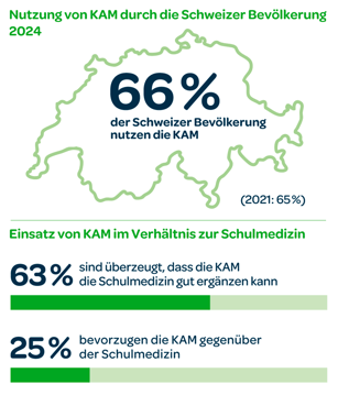 Die Schweizer Bevölkerung vertraut in die Komplementär- und Alternativmedizin: Zwei Drittel haben sie schon in Anspruch genommen, und von ihnen geben 87 Prozent an, dass die Behandlung erfolgreich war. Das zeigt die neue repräsentative Umfrage «KAM-Barometer 2024». Als Erfahrungsmedizin bezeichnet die Studie die Methoden und Arzneimittel der Komplementär- und Alternativmedizin (KAM). Die repräsentative Umfrage, die vom ErfahrungsMedizinischen Register EMR in Auftrag gegeben wurde, zeigt, dass sich die Erfahrungsmedizin seit der letzten Erhebung 2021 weiter im Schweizer Gesundheitswesen verankert hat.